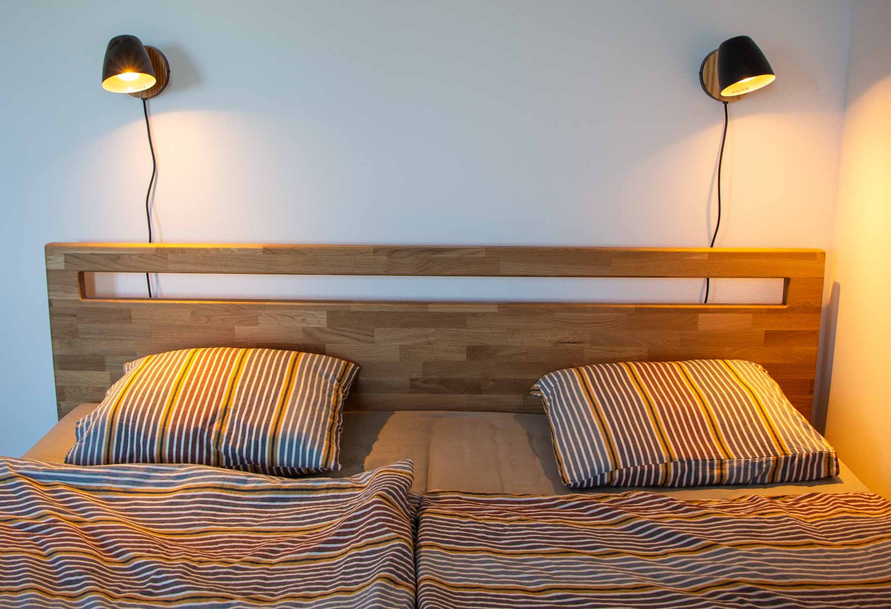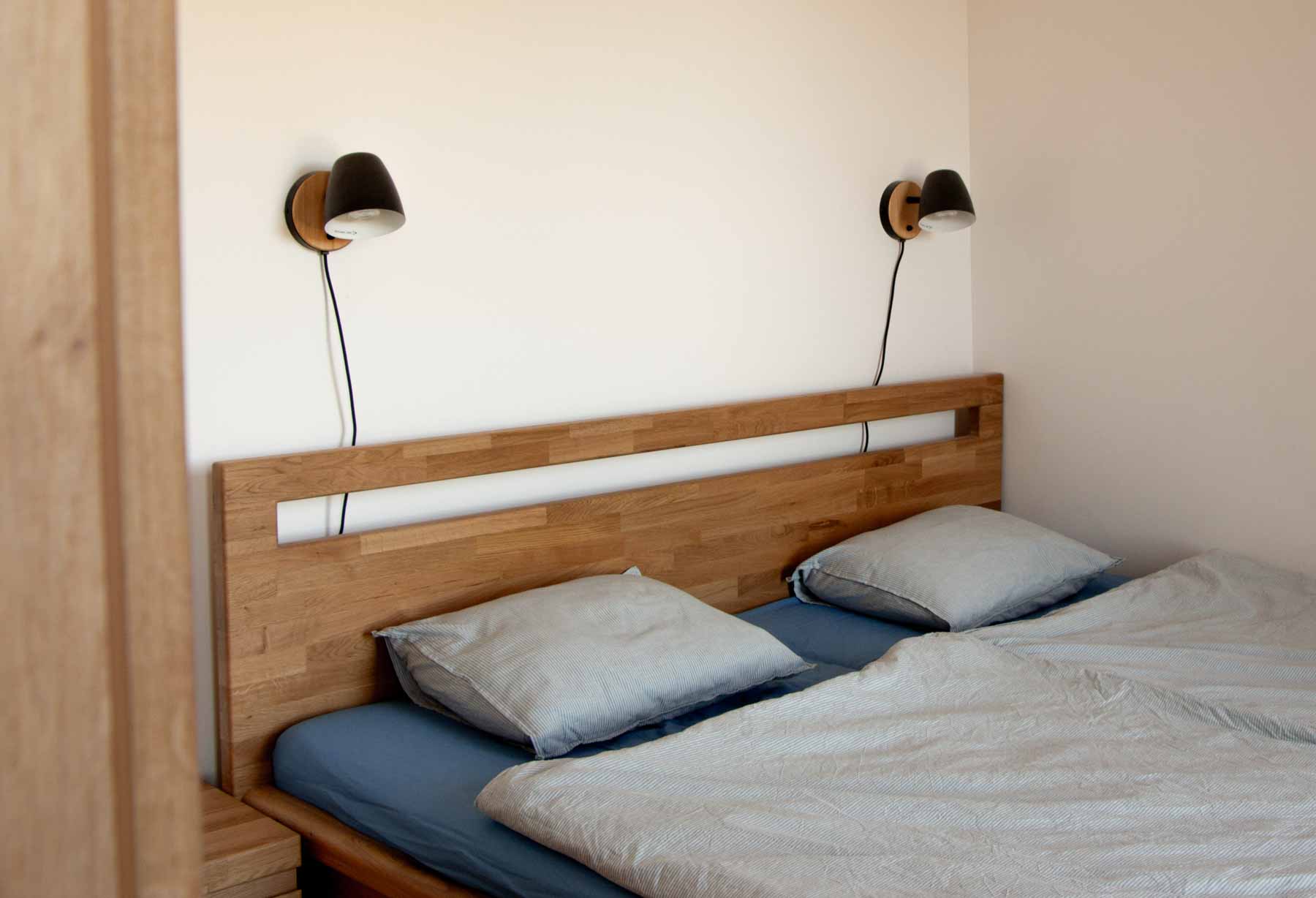 Apartmán zahrnuje obývací pokoj s plně vybavenou kuchyní, dvě ložnice, koupelnu a chodbu.